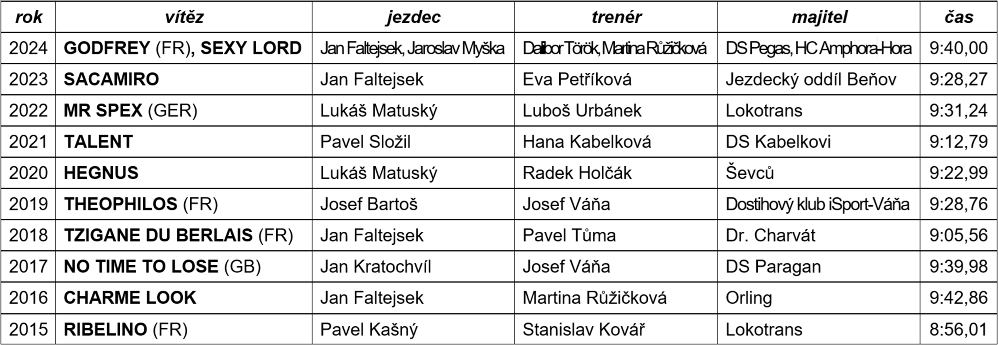 5 z 11 posledních vítězů bylo českého chovu. Vítěznou sérii koní zahraničního chovu, která se psala od roku 2002, utnul v roce 2016 Charme Look, v roce 2020 zvítězil Hegnus, o rok později Talent, v roce 2023 Sacamiro a loni Sexy Lord. Letos český chov zastupuje pětice Cuwall, Čáryjape, Sexy Lord, Stormmy a Ztracenka. Čeští odchovanci tak tvoří 33,3 % startujících koní, zatímco předloni byl jejich podíl 37,5 % a předloni dokonce 44,4 %.